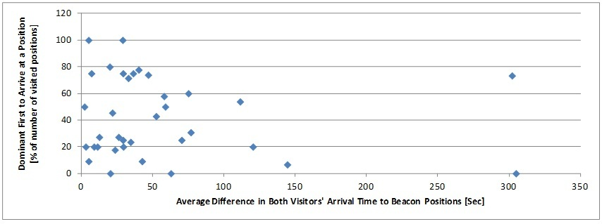It is also interesting to detect whether a pair member is usually the first (dominant geese behavior), or whether the pair members alternate in taking the leading role. A summary of all 35 pairs is shown in figure 5. The X axis is the average time difference (in seconds) between both pair members’ TOA at positions covered by Beacons. The Y axis shows the percentage of cases where one visitor arrived at a position prior to the other out of the total visited positions that were covered by Beacons. Each blue diamond represents the value of one of the pairs. A high value on the Y axis represents a higher probability that one visitor is ahead of the other (geese behavior), whereas a low value represents a higher probability that the two visitors alternate in taking the leading position. As for the X axis, the shorter the TOA difference between the two visitors, the greater the synchronization between them (i.e., they move together from one place to another). A high value on the X axis means that the two pair members are less coordinated (lone-wolves behavior).